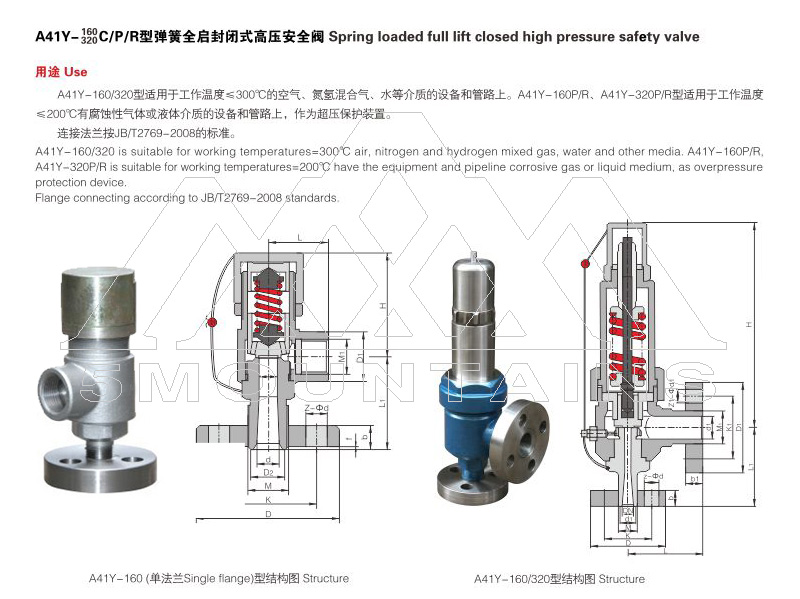 A41Y-160/320型彈簧微啟封閉式高壓安全閥適用于工作溫度≤200℃的空氣、氮氫混合氣、水等介質的設備和管路上。A41Y-160P/R、A41Y-320P/R型彈簧微啟封閉式高壓安全閥適用于工作溫度≤200℃有腐蝕性氣體的設備和管路上,作為超壓保護裝置。